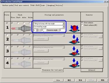 四、刀路4 複製刀路3。設置干涉檢查參數Clearance angle(間隙角度)為3度。此參數是CimatronE9新增參數。見下圖: